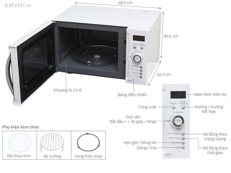 – Tiện ích:Chuông báo khi nấu xong, Khoang lò có đèn, Hẹn giờ nấu